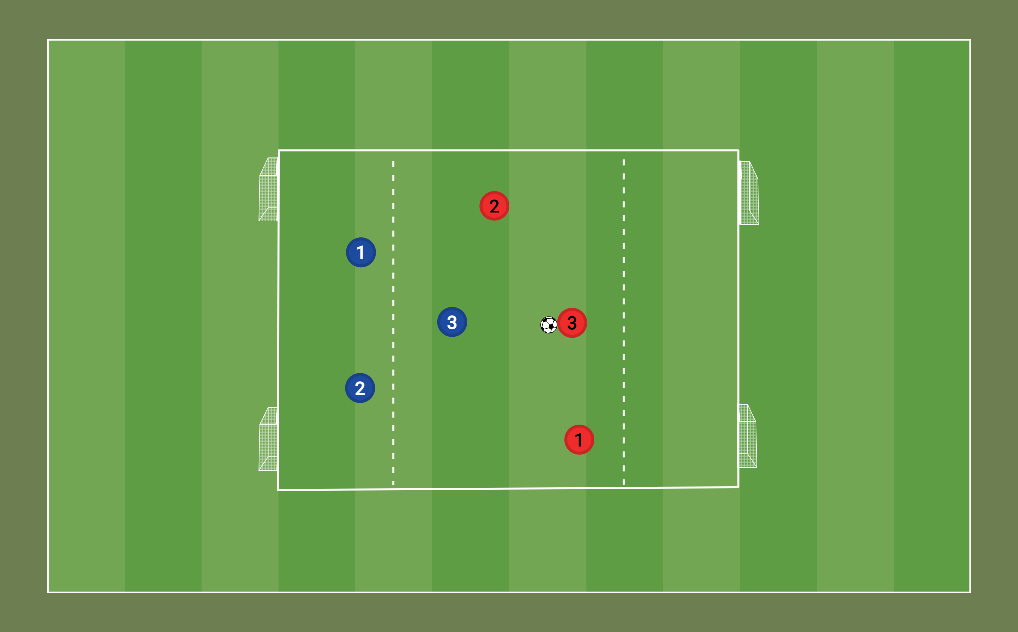 Matchformat: 3v3. Varje lag anfaller mot två mål och försvarar två mål.