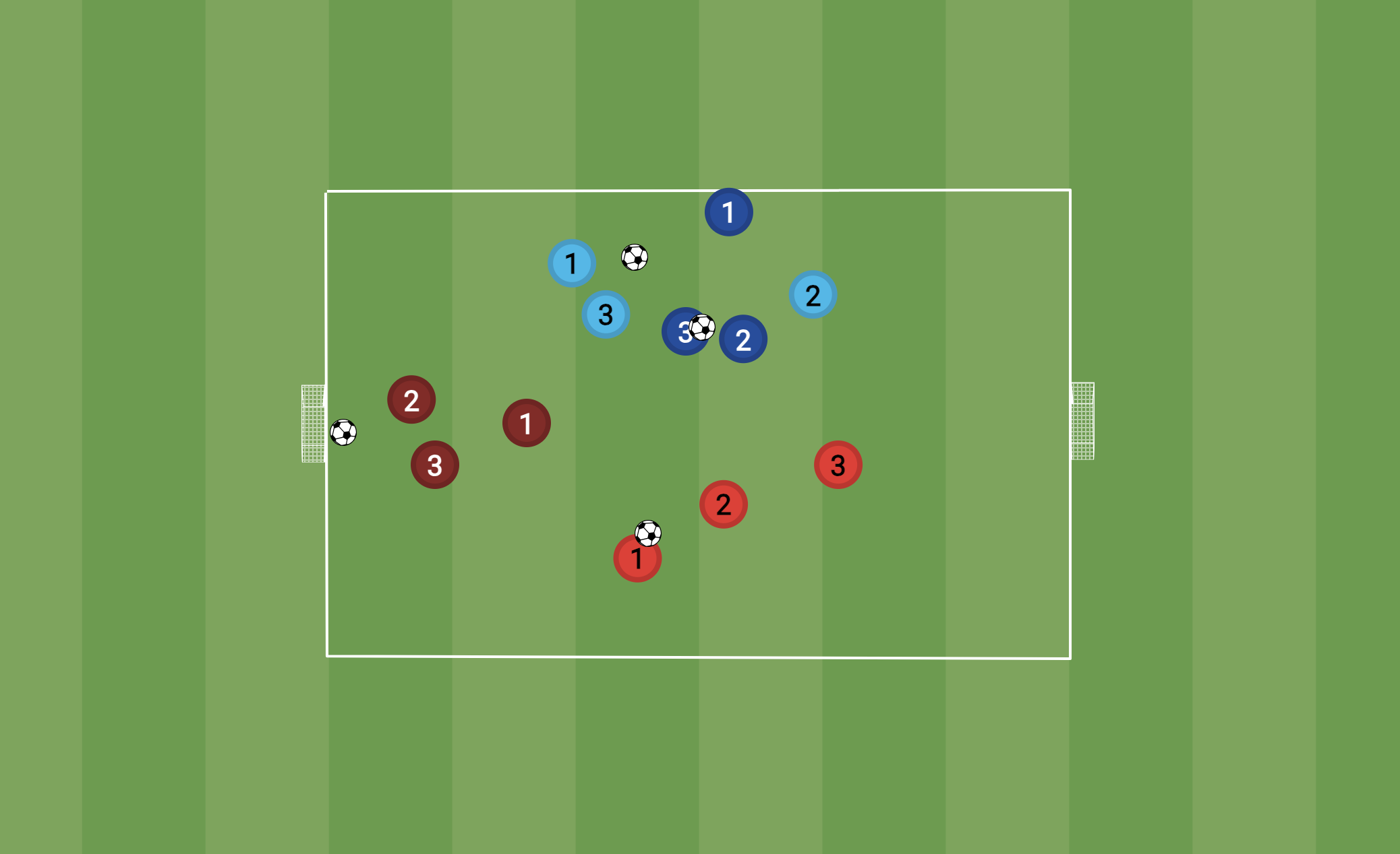 - I varje grupp spelar två anfallare mot en försvarare (2 mot 1) med en boll.