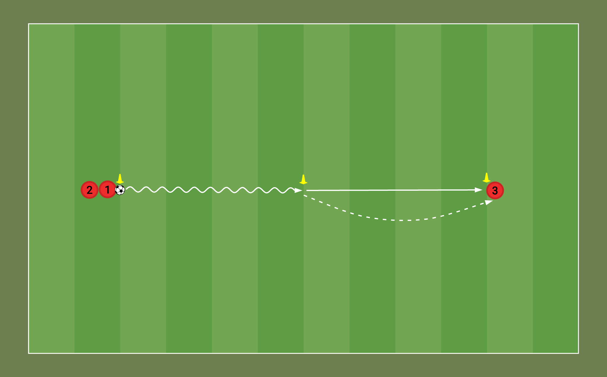 Passning: Vid ankomst till mittenkonen slår Spelare 1 en distinkt markpassning till Spelare 2 som väntar vid led C.